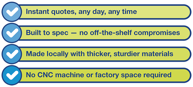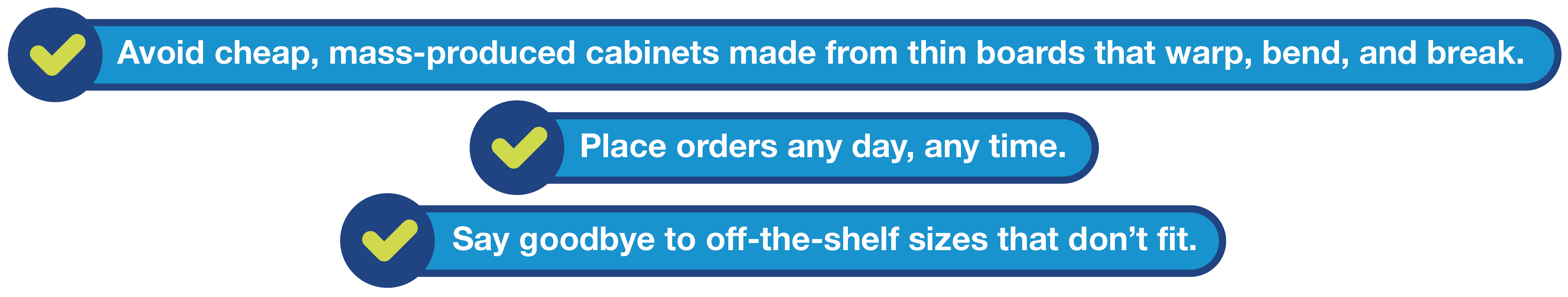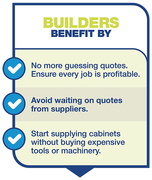 You can quote, customise, and order full kitchens, vanities, and laundries online in minutes. No edge banders, no panel saws, no CNC machine required. Just enter your sizes, choose your options, and get the cabinets made by a local manufacturer — ready to pick up or have delivered.